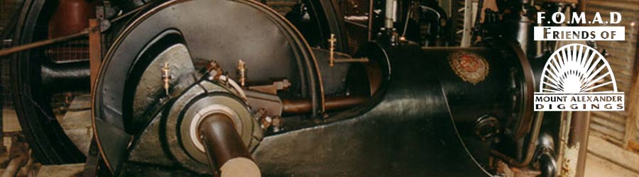 Rejuvenated "Ruby", the Ruston & Hornsby gas suction engine used by the late Alf Cocks to pump water for his sluicing operations at the Forest Creek Historic Gold Diggings site in Wesley Hill. ìSheî is now powered by an electric motor driving the massive 5 ton flywheel and two huge pistons. (small pic of the engine Ruby.jpg) |